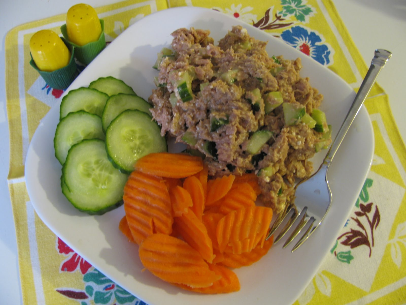 Combine first 5 ingredients in blender and whiz smooth. (Warning: DO NOT make the mistake of smelling this mixture. It will scare the bejesus out of your senses). Combine cucumber and tuna in a bowl then add cottage cheese mixture.